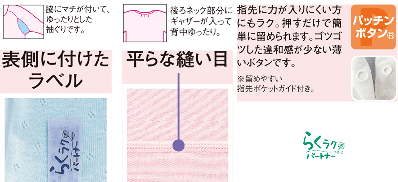 主材料 身生地 : 綿 100% 商品説明 ●介護にもおすすめ【八分袖パッチンボタン】 「らくラクパートナー」は、ほどよいゆとりをもたせたパターン設計。