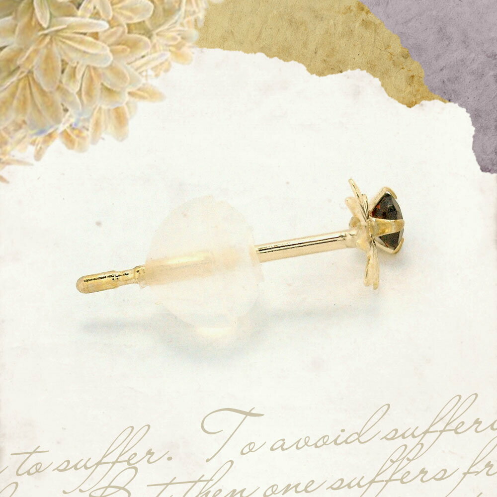 素材:K10イエローゴールド(10金) ポストにK10の刻印有り 石:ガーネット ラウンドカット約2mm ポストサイズ:直径約0.65mm 長さ約10mm 重さ約 0.3 g (ペア)